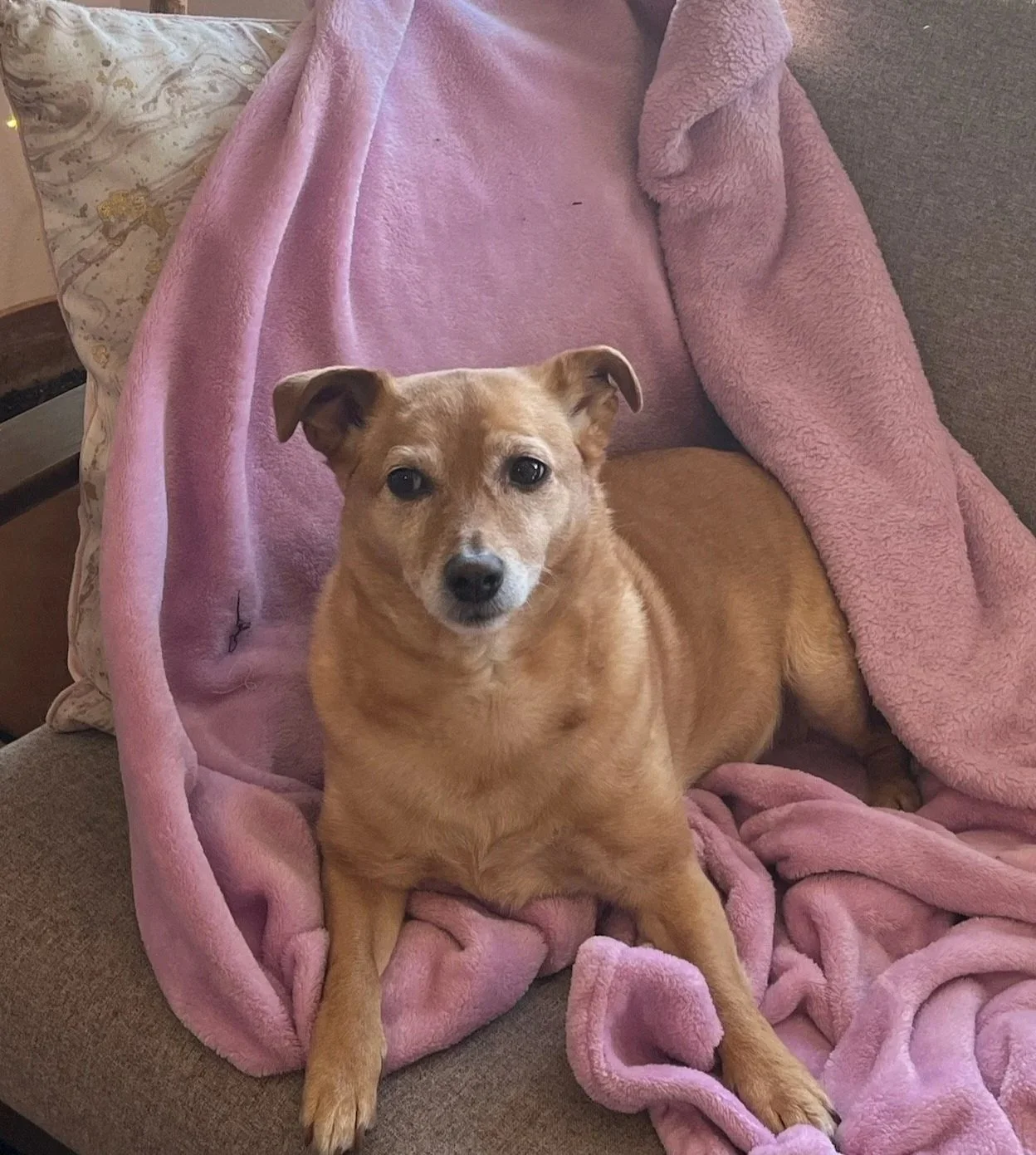 Cleo cuddled on her pink blanket in the To The Point PDX clinic.